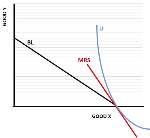 It is also possible that a corner solution could occur on the other axis, with an indifference curve that is flatter than the budget line. In that case MRS < -Px/Py.